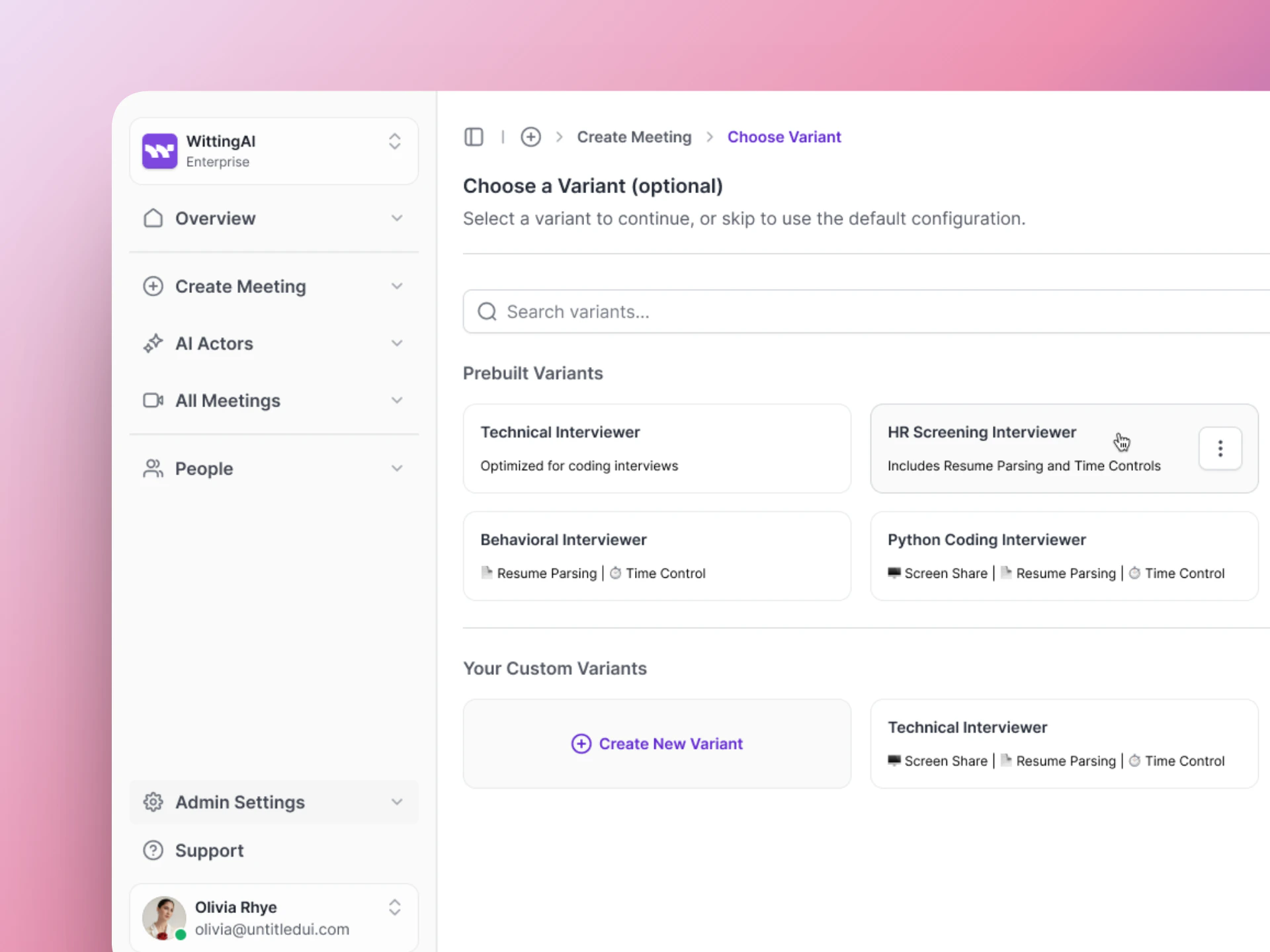 Pick the AI Actor that will run this interview. If you have created variants (modified versions of an AI Actor), you can select a specific variant here.
