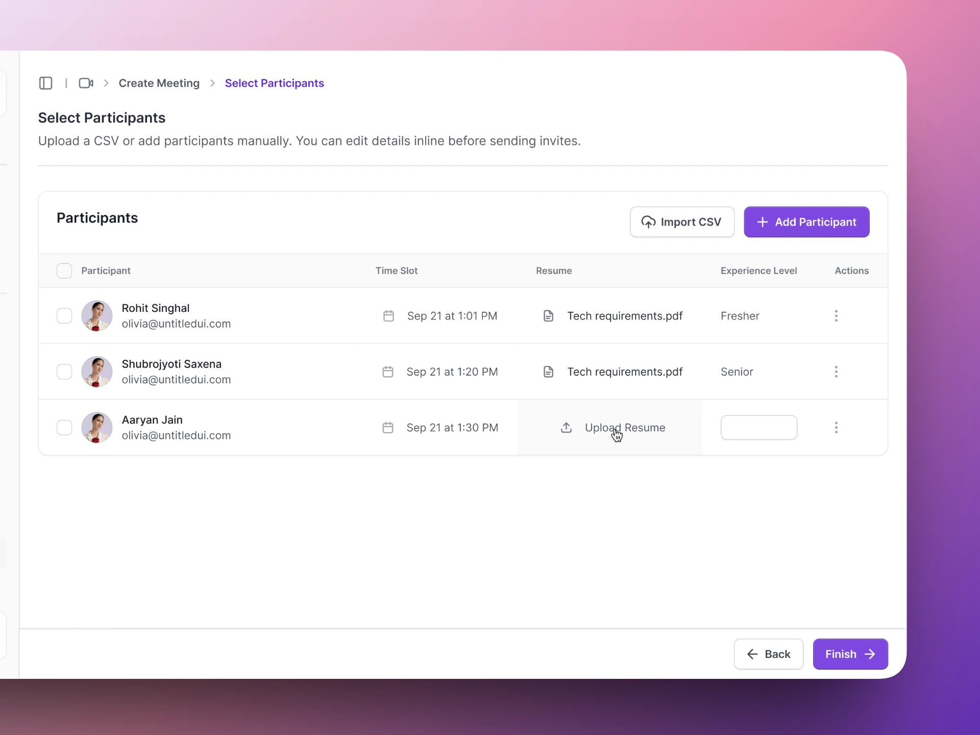 Add the candidate(s) who will be interviewed:- For Google Meet: Enter the candidate’s name and email address. Vocalis sends them a calendar invite with the Meet link.