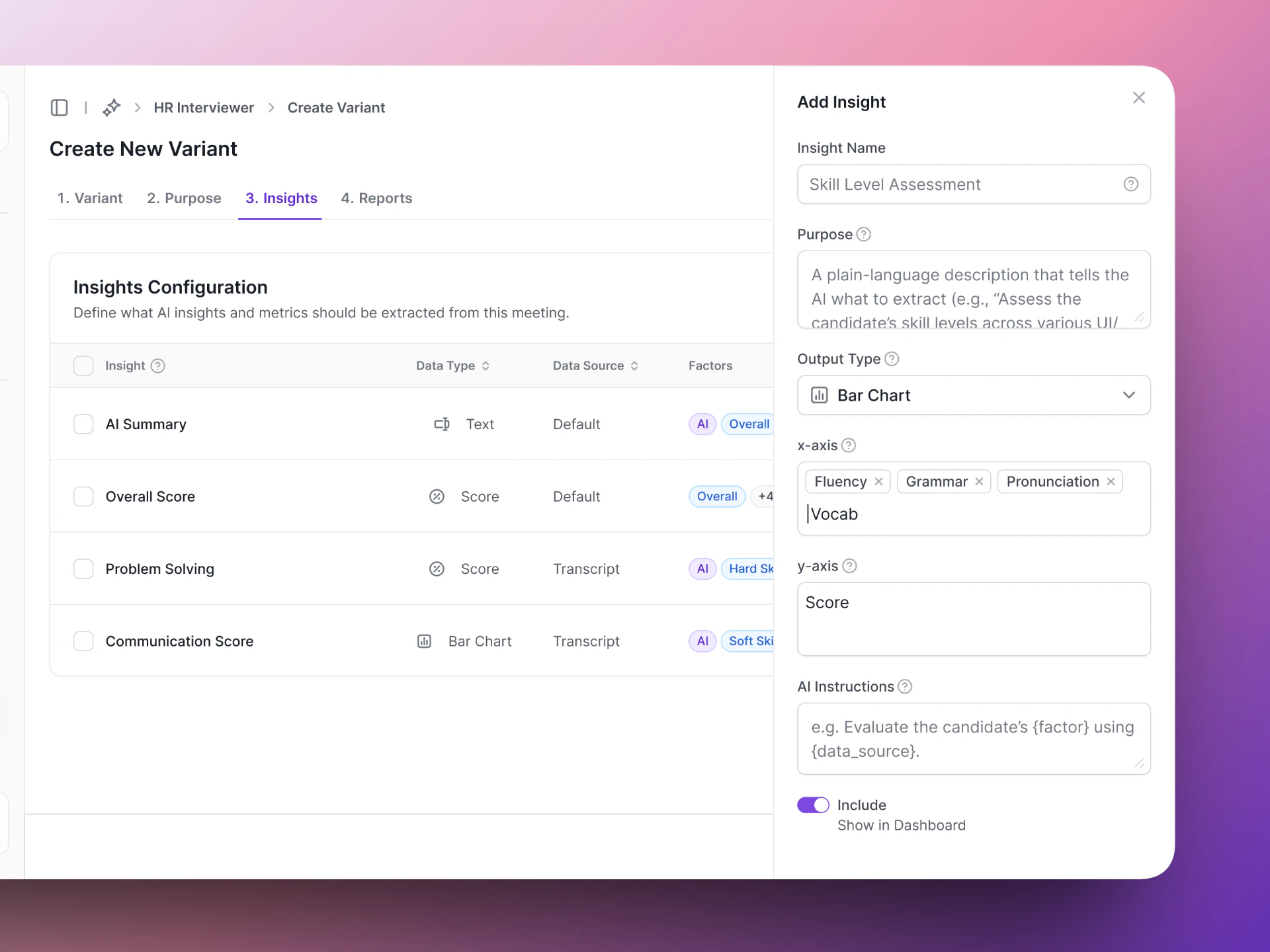 Define the structured data points Vocalis should extract from each conversation. See Actor Insights for details on configuring insights.